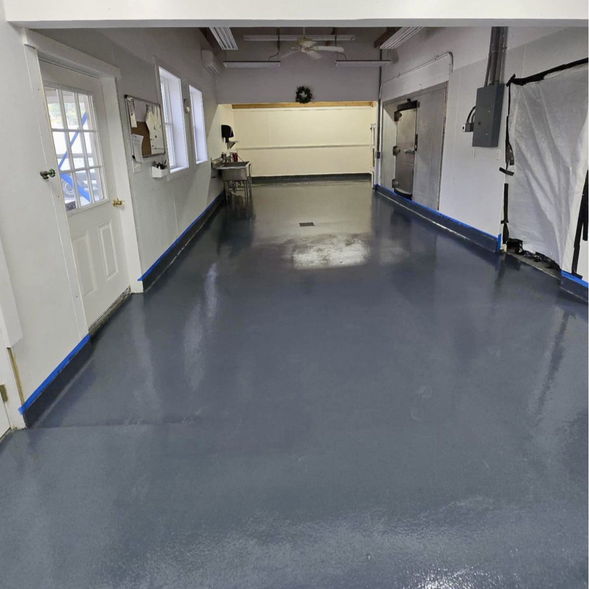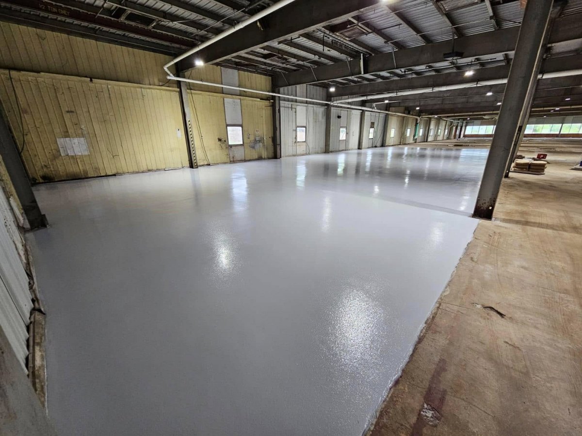 High build, double broadcast system using silica quartz aggregate and sealed with a pigmented top coat.
